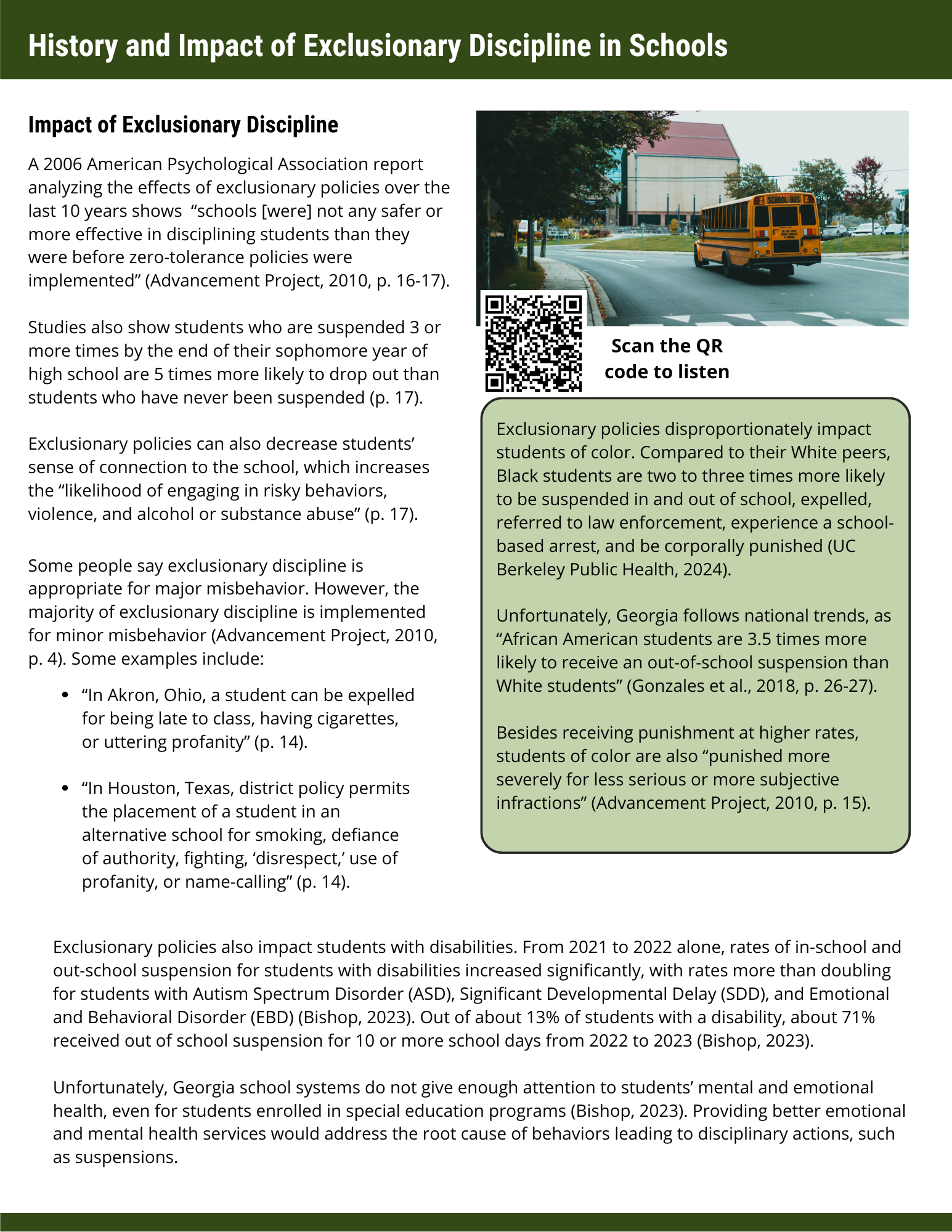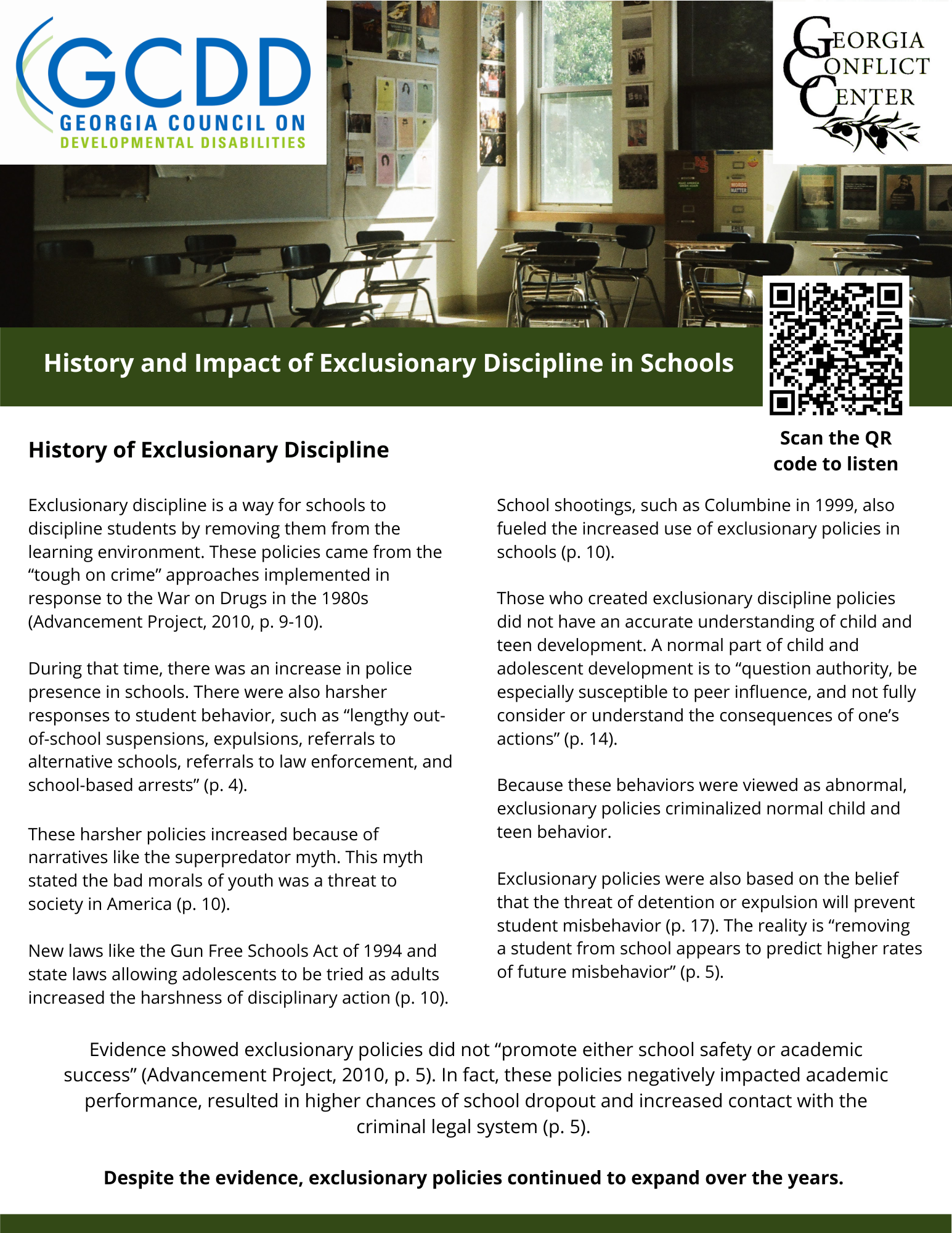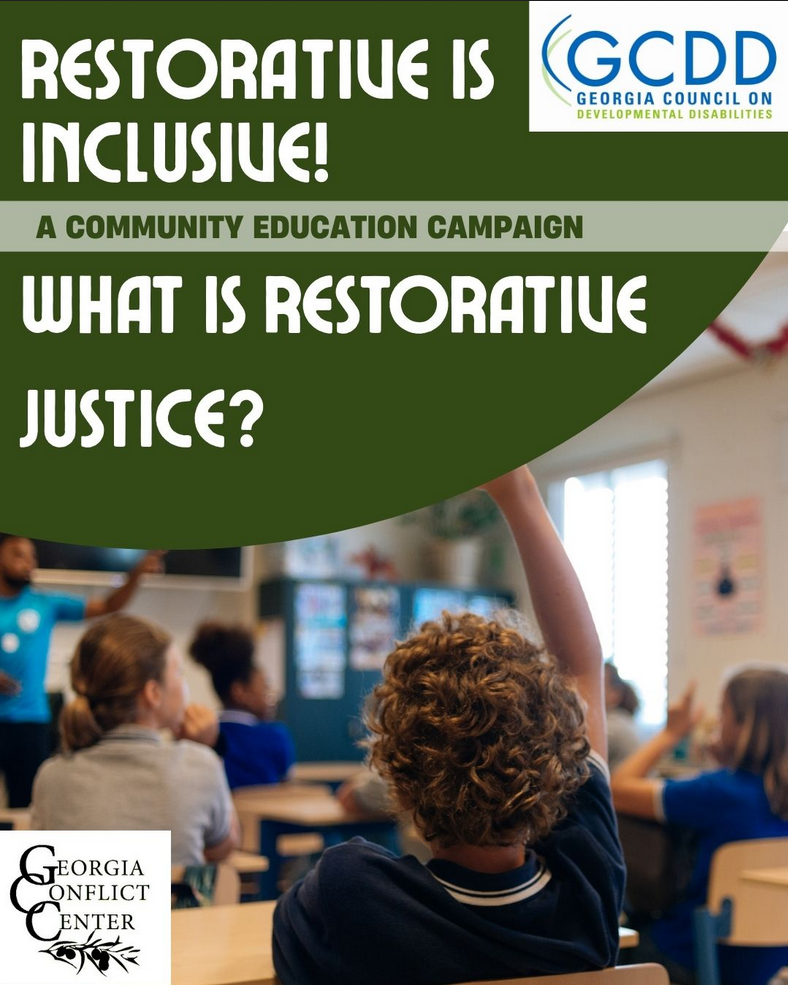 The Georgia Conflict Center's Restorative Justice Campaign "Restorative is Inclusive" is geared toward spreading awareness of Restorative Justice as an alternative to exclusionary discipline and punitive practices. This video focuses on what we know, from studies surrounding exclusionary discipline and the compounding effects they have on students with developmental disabilities and students of color.